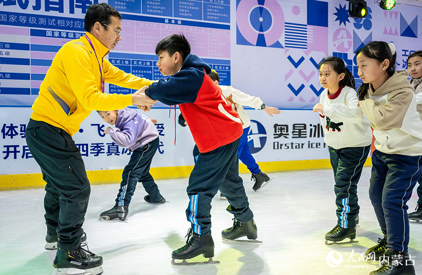 内蒙古呼和浩特市玉泉区小召小学学生在专业教练的带领下练习滑冰。丁根厚摄