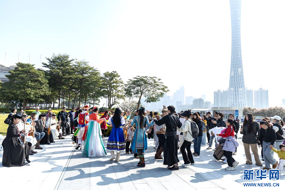 12月27日,内蒙古呼伦贝尔市乌兰牧骑队员在广州市街头进行文艺路演。新华网发
