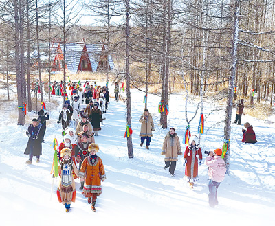游客在根河林区体验文化活动。