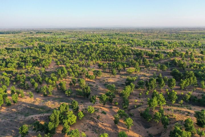 这是2023年6月14日在毛乌素沙地拍摄的一片树林(无人机照片)。新华社记者 刘磊 摄
