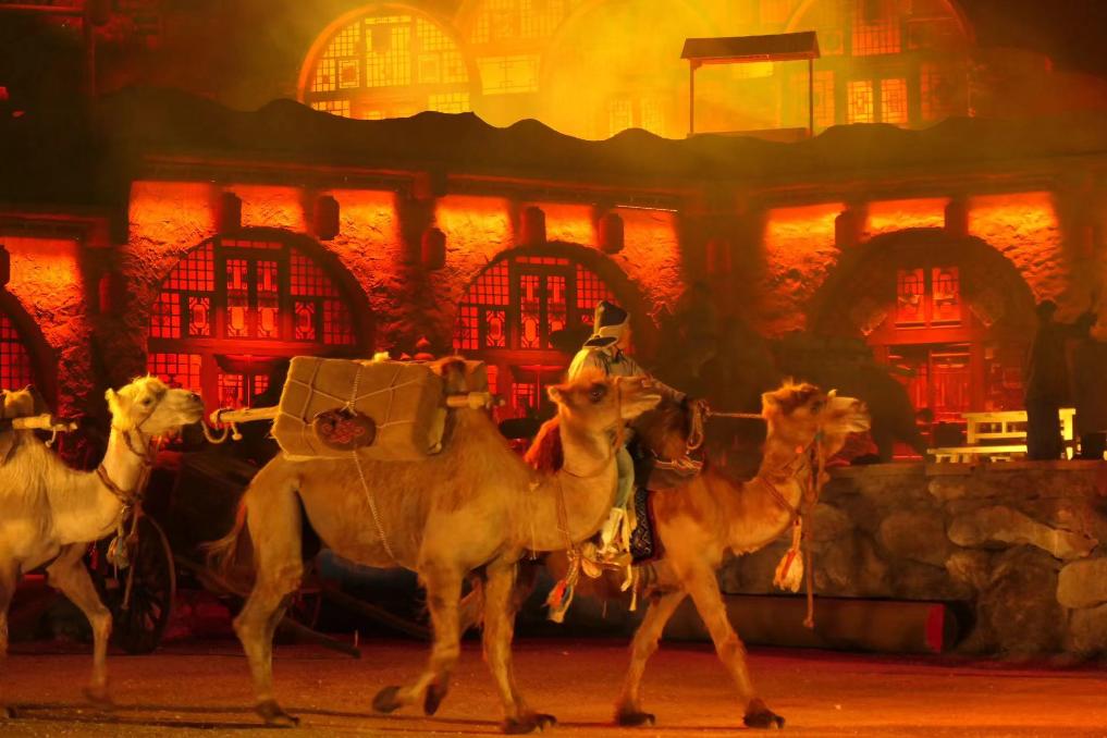“出发喽!”随着驼夫号子响起,几峰驮着货物的骆驼从驿站前缓缓走过,后面跟着挑扁担的货郎和推小车的工匠。一支走西口的商队,从历史深处走来,走到莫尼山非遗小镇,为游客呈现了一场沉浸式实景剧《莫尼山礼赞》。