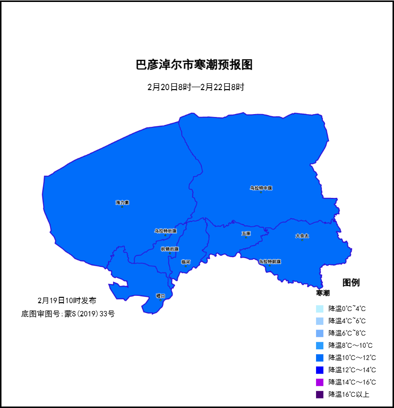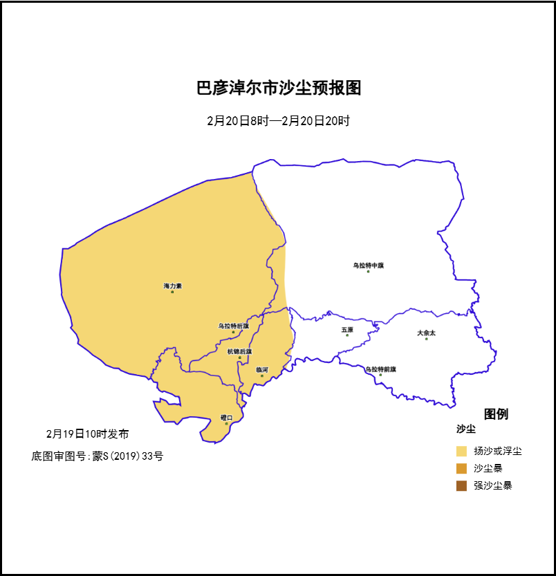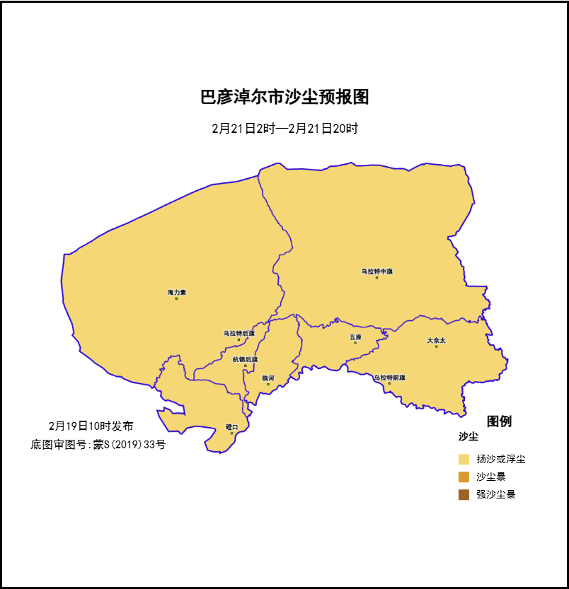 图1 巴彦淖尔市2月20日至22日大风沙尘、降雪、寒潮预报图