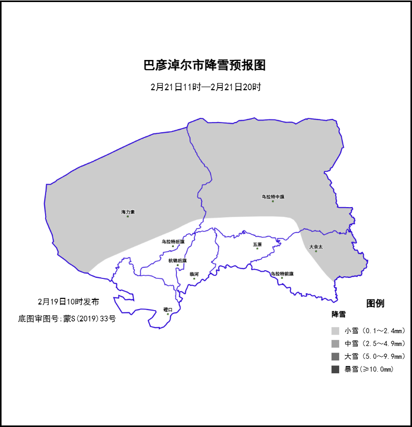 降雪:21日白天乌拉特后旗北部、乌拉特中旗、乌拉特前旗东北部有分散小雪,降雪量0~2毫米。
