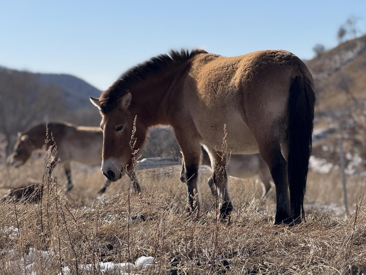 二月中旬,大青山的气温仍低至零下十几度,呼出的白气在晨光里团团散开。眼前的野马基地,是一片用围栏隔开的广阔山地,几匹毛色棕黄、体格健硕的野马伫立在草地上,警觉地望着来客。