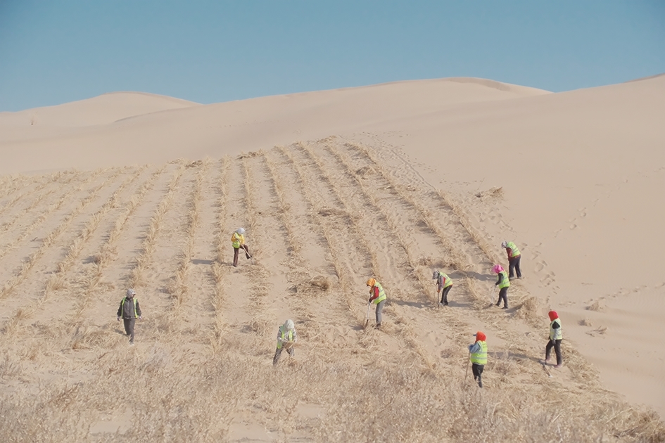 近日,在杭锦后旗乌兰布和沙漠综合治理区施工现场,工人们在沙丘坡面分散作业,有的铺设稻草,有的压实沙障,成片草方格沿沙丘铺展。