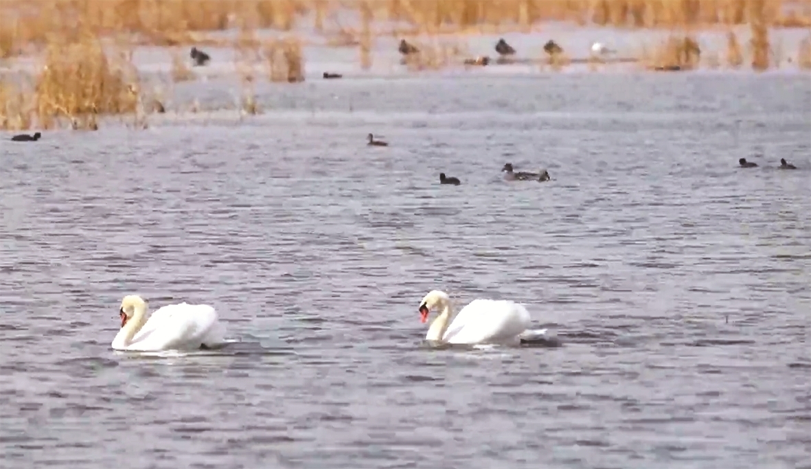 从研究站向湿地核心区进发,只见沿途冰雪消融,水域辽阔。赤麻鸭成群觅食,疣鼻天鹅悠然游弋,苍鹭、白鹭、斑头秋沙鸭、灰雁等遍布湖面。乌拉特国家级自然保护区管理局工作人员杨道尔基告诉记者,今年受气候偏暖影响,候鸟回归较往年略早,目前已广泛分布于消融冰面,栖息范围持续扩大,部分候鸟已开始筑巢,将陆续进入孵化期。