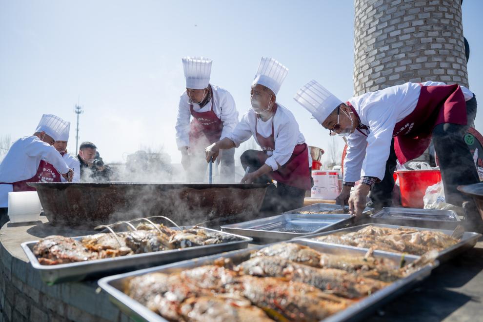 民俗文化周现场,一锅锅炖鱼翻滚出浓郁香气,8口大锅一次炖煮3000斤黄河鲜鱼,供群众及游客免费品鉴。郝家窑村居民郝争平正埋头炖鱼,动作娴熟利落。作为村里第一个开办农家乐的“先行者”,如今他已是当地炖鱼争霸赛的主厨之一。
