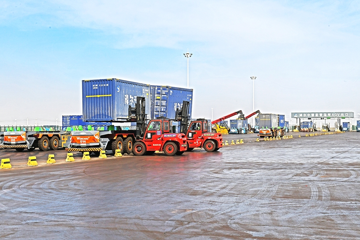 近日,在甘其毛都口岸淖尔中慧海关监管场所作业现场,一辆辆AGV无人驾驶跨境运输车有序穿梭。依托智能通关系统,车辆30秒就可“无感入境”,经过H986大型机检设备非侵入式查验后,全程实现闭环管理、高效流转。“每辆AGV装载两个标准集装箱,全程油转电驱动。单日运输量达7~8趟,不但运输效率比传统车辆高,而且实现了零接触、低能耗、高安全运输。”内蒙古淖尔中慧物流有限公司副总经理王博介绍。