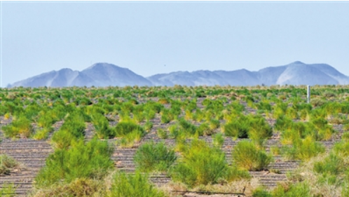 在巴彦淖尔市磴口县,新栽植的四翅滨藜不仅防风固沙,成活后还能在根部接种肉苁蓉,经过2至3年生长即可采收,形成“治沙—种草—增收”的良性循环。