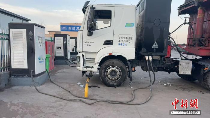 图为鄂尔多斯市伊金霍洛矿区物流园一辆正在充电的新能源重卡货车。 薛峰供图