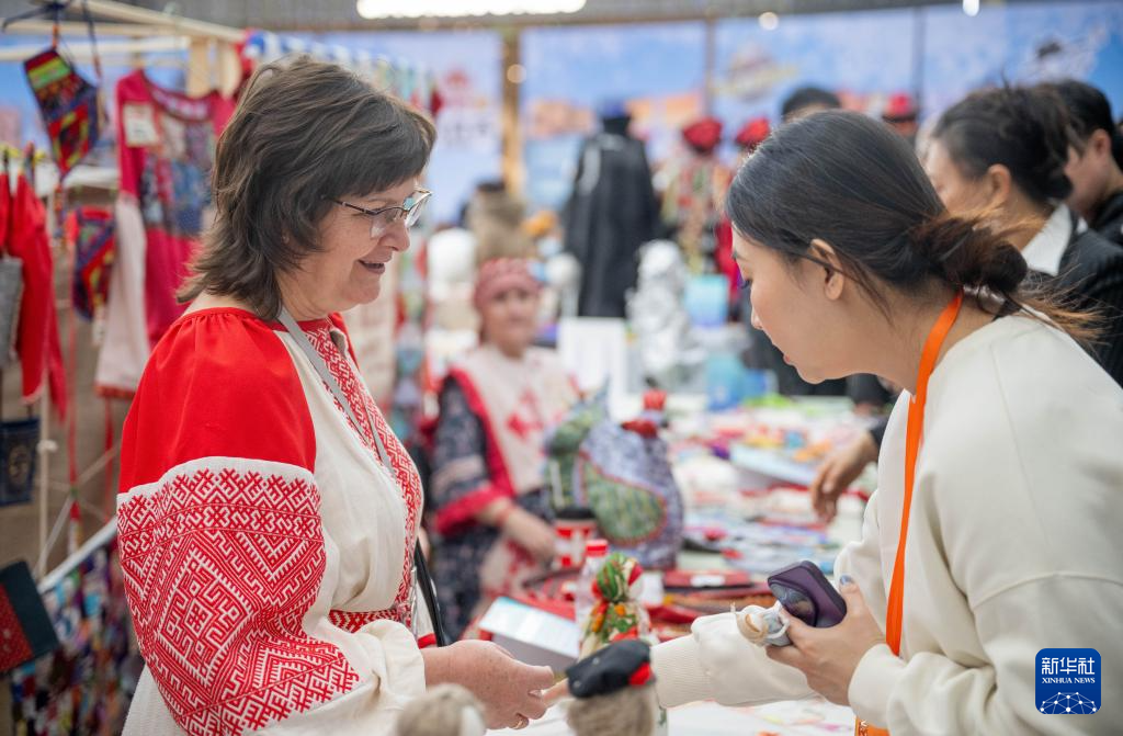 2025年12月20日,满洲里市民在一场文化交流活动中了解俄罗斯手工艺品。新华社记者 连振 摄