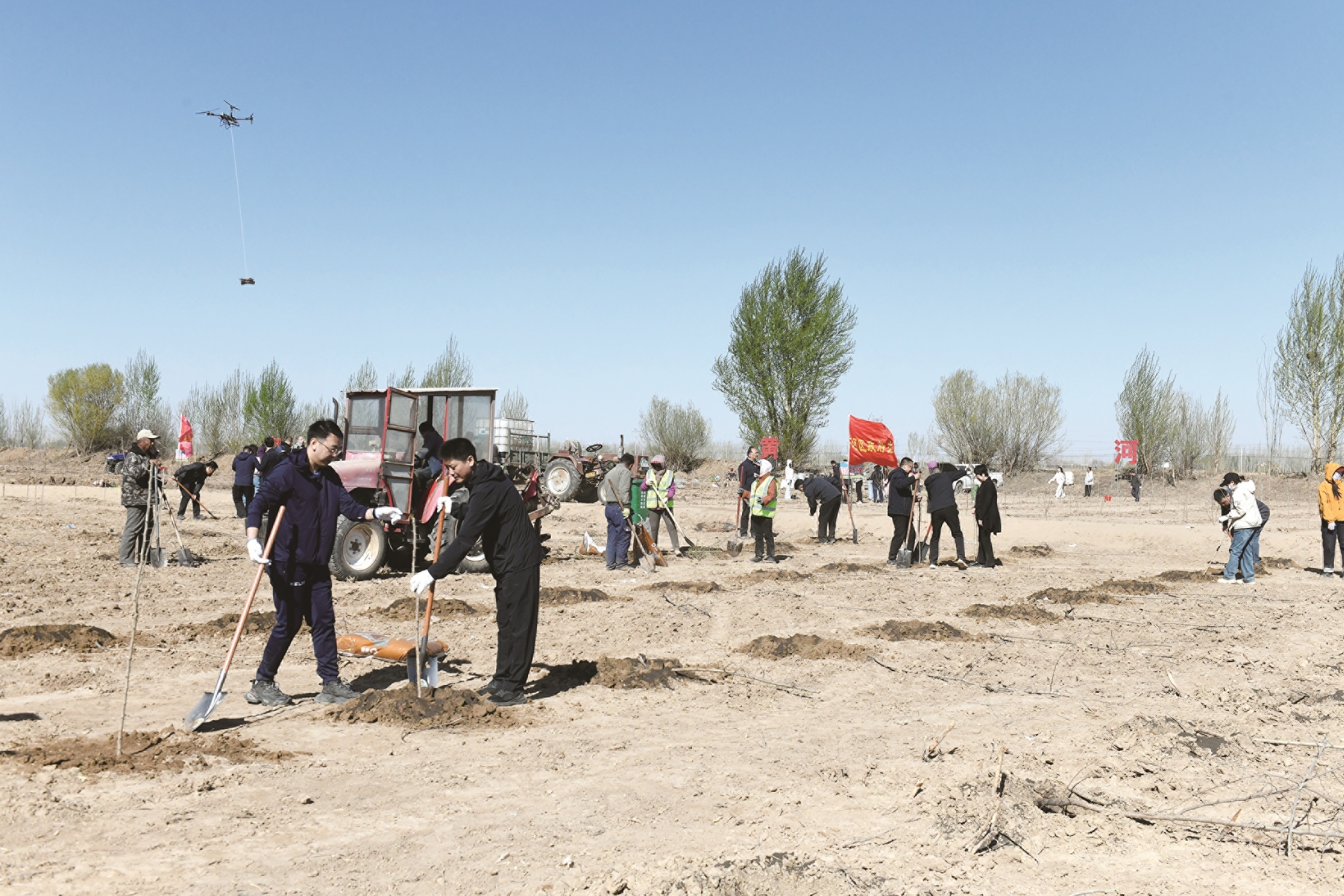 “在此次义务植树活动中,我们通过‘机械+智能+人工’协同模式,创新采用有机肥、生物炭等盐碱地专用改良剂,全面应用无人机精准吊装、智能灌溉系统及机械化栽植装备,有效提升了植树作业的智能化水平。”市林草局治沙造林科科长焦慧亮说,“今年,我们认真贯彻落实自治区党委‘1571’工作部署,聚焦沙漠沙地、退化草原、河套灌域、湿地修复4大战区,聚力打造乌兰布和沙漠百万亩沙草产业增绿生金工程、黄河北岸绿色生态廊道建设工程等6个标志性工程。全年计划完成林草生态建设800万亩以上,目前已完成治理93万亩。”
