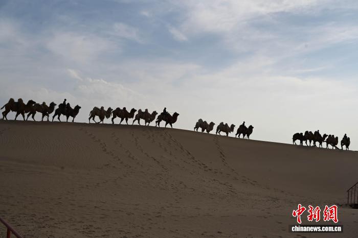 通辽市奈曼旗宝古图沙漠旅游区,行进的骆驼队。 中新网记者 刘文华 摄